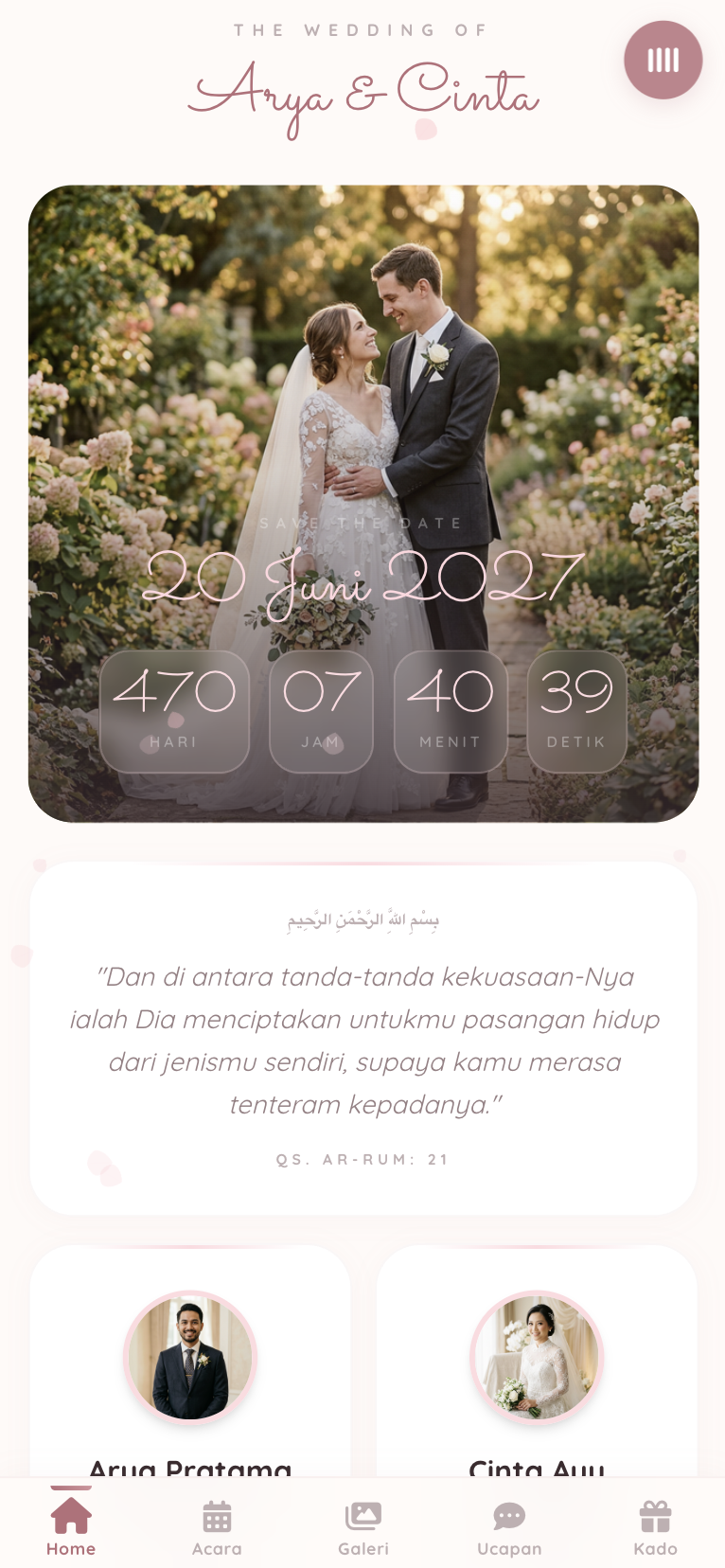 Ciptakan undangan digital yang elegan, interaktif, dan berkesan dalam hitungan menit. Pilih template, isi data, langsung bagikan.